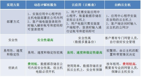 動態(tài)IP解析服務(wù)、云應(yīng)用(云賬套)、自購云主機(jī)這三種方式都可以實現(xiàn)通過互聯(lián)網(wǎng)遠(yuǎn)程使用信管飛軟件,三種方案的部署方式、安全性、易用性及優(yōu)缺點對比如下圖所示:
