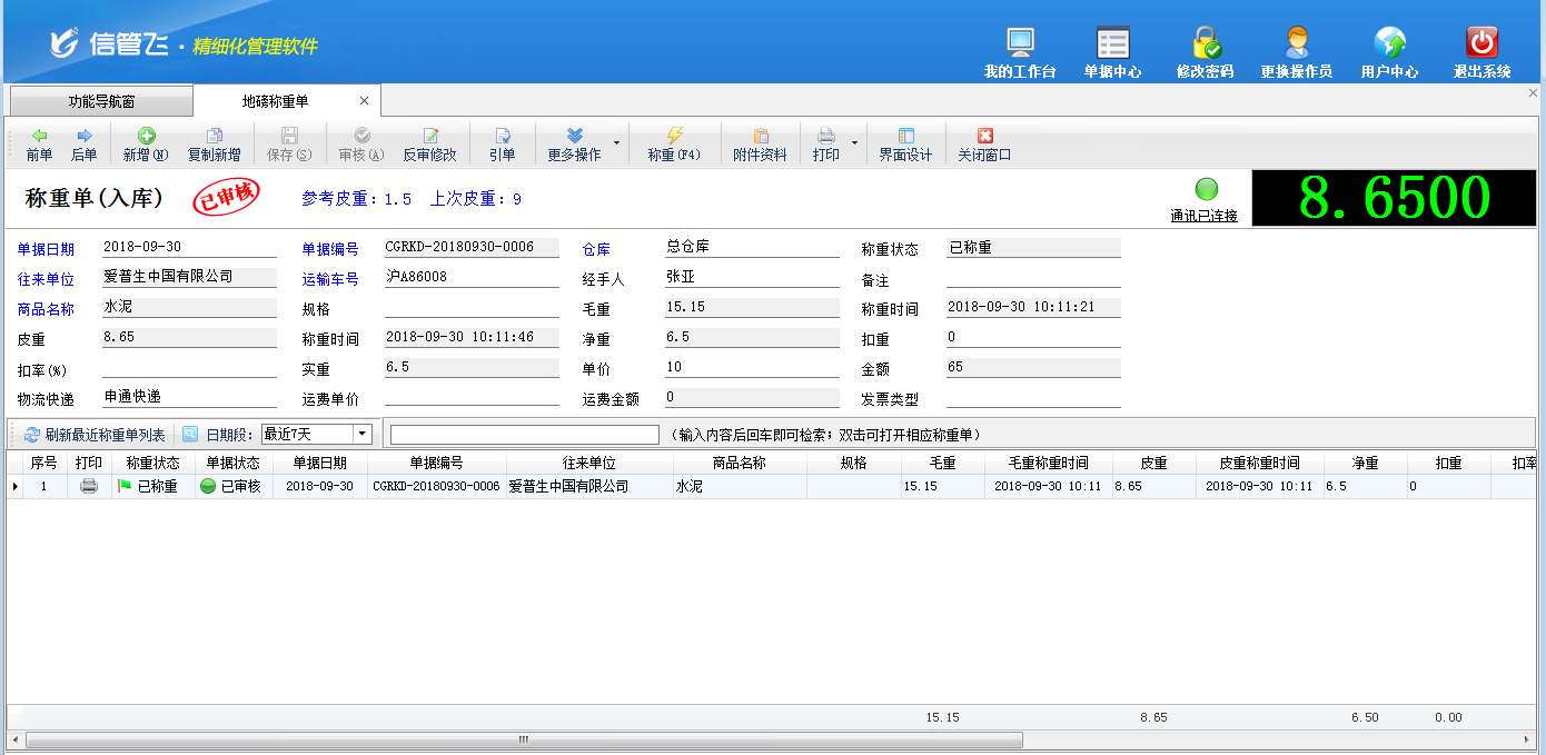 功能描述:可以連接稱重設備自動讀取稱重數據,軟件內支持“稱重兩次”、“稱重一次自動去皮重”、“稱重一次不要皮重”三種方式,可以自由設置稱重方式,對稱重的單據數據進行記憶。有效管理稱重數據,提高工作效率。已開的單據記錄軟件中支持查詢。