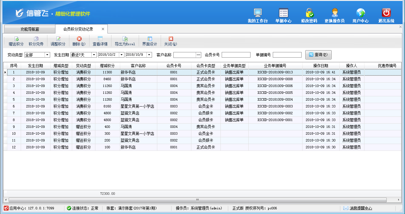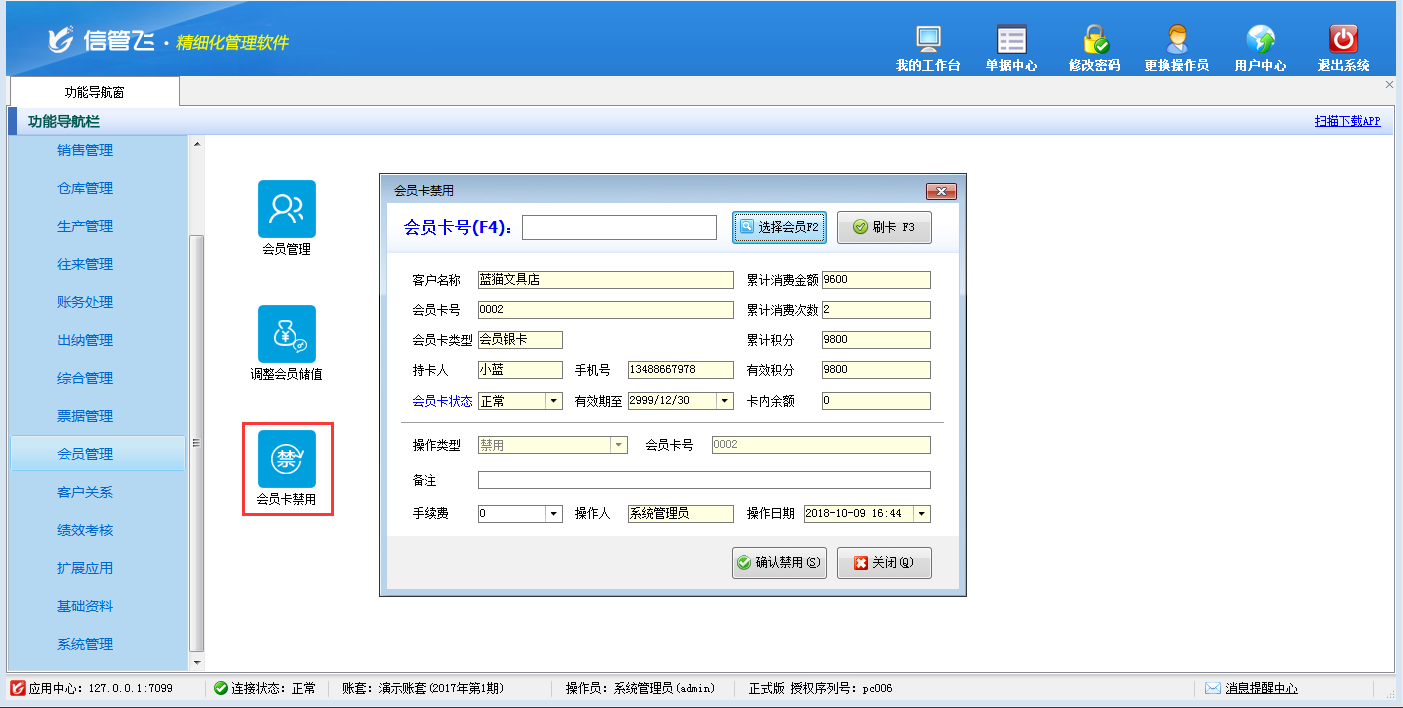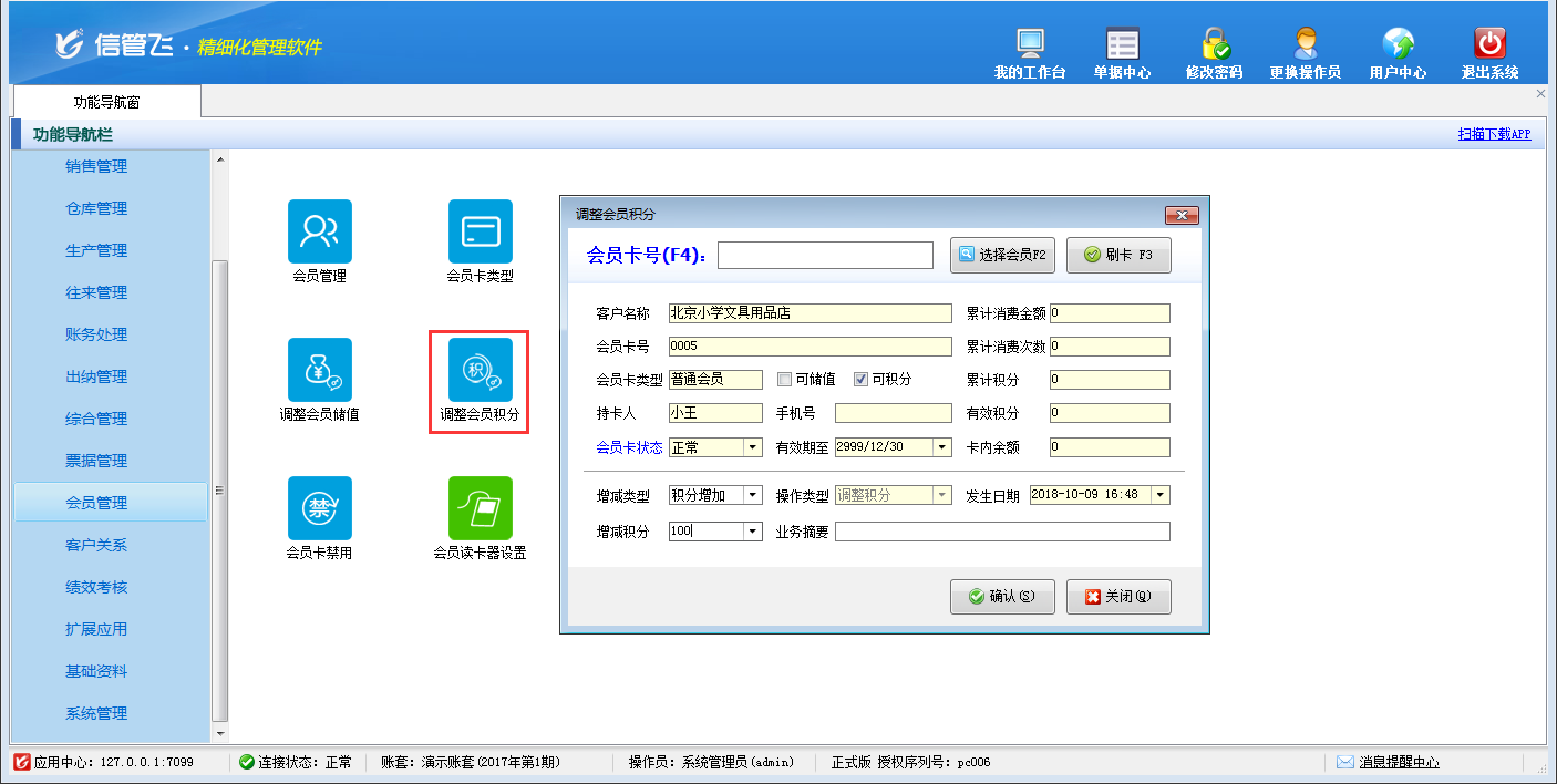 包括功能:會員卡類型維護、會員積分管理、會員儲值管理、調整會員儲值、調整會員積分、會員卡充值、積分兌換、會員卡補退換、會員卡掛失、會員卡禁用、會員讀卡器配置等。