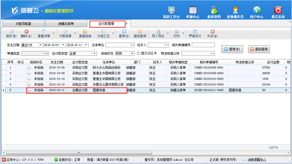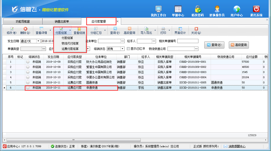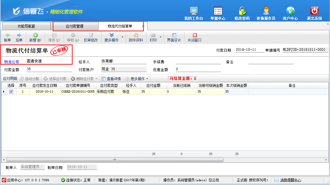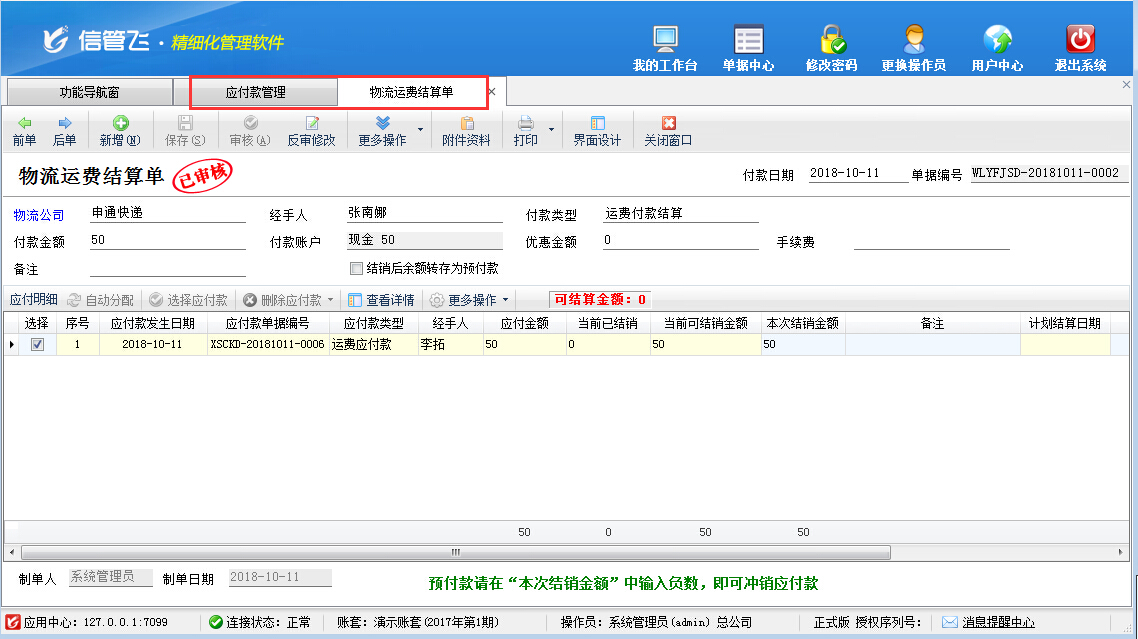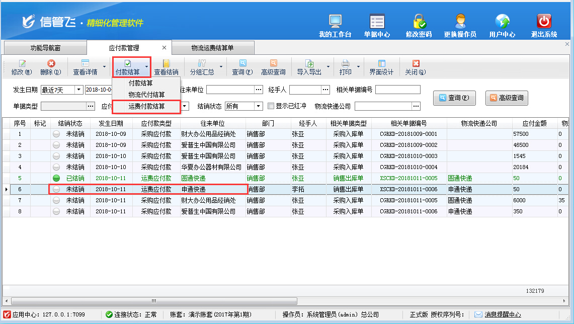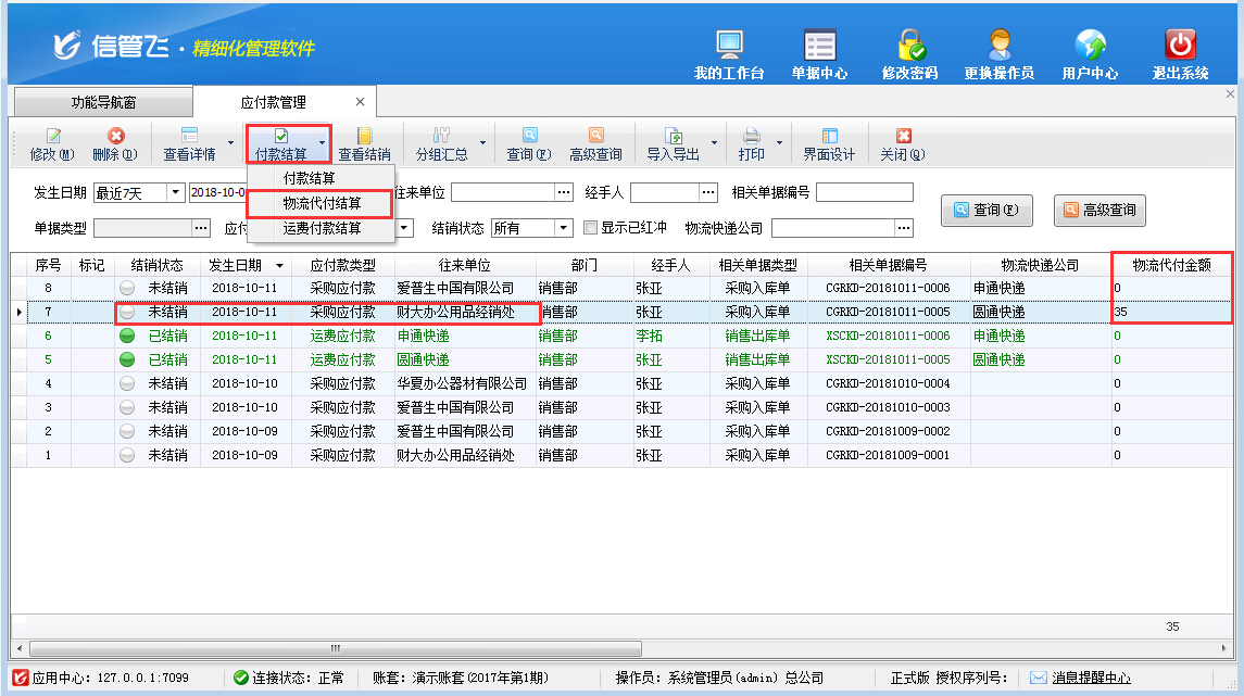 物流運(yùn)費(fèi)結(jié)算功能包括:物流運(yùn)費(fèi)應(yīng)付款結(jié)算、物流運(yùn)費(fèi)代付結(jié)算、物流運(yùn)費(fèi)代收結(jié)算 在往來(lái)管理—》應(yīng)付款管理中進(jìn)行運(yùn)費(fèi)應(yīng)付款結(jié)銷(xiāo)且對(duì)應(yīng)生成物流運(yùn)費(fèi)結(jié)算單。