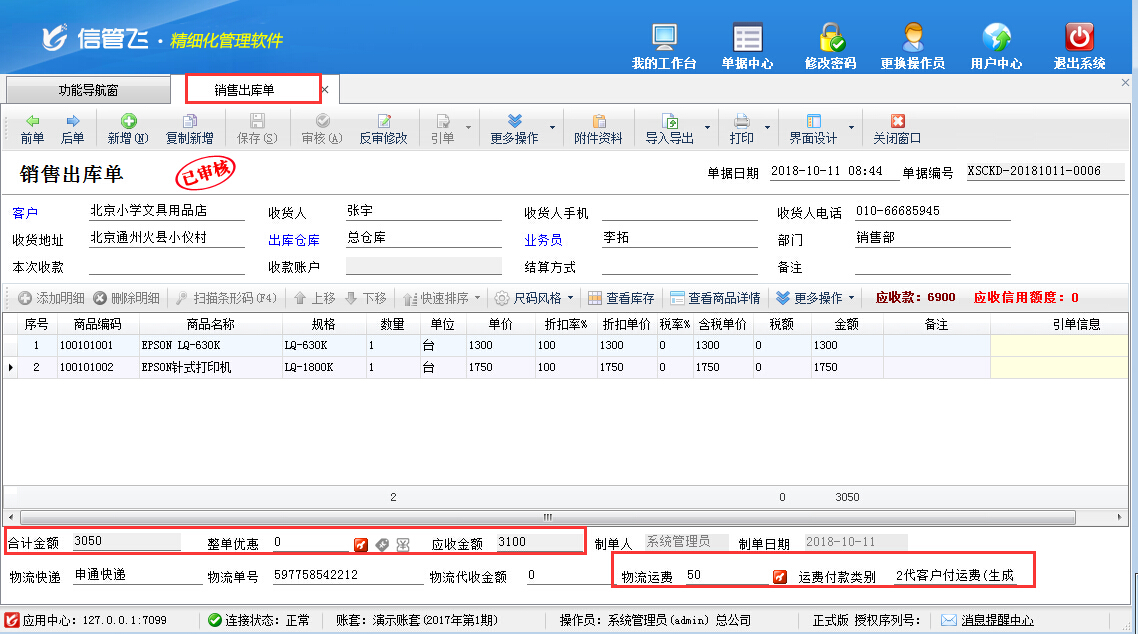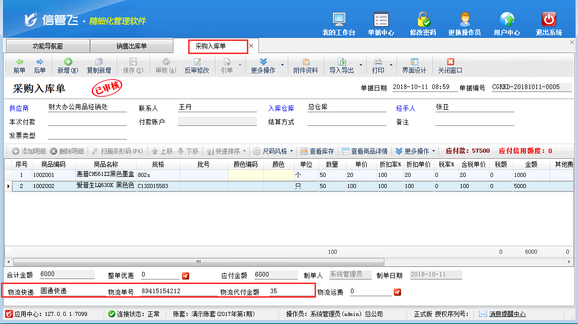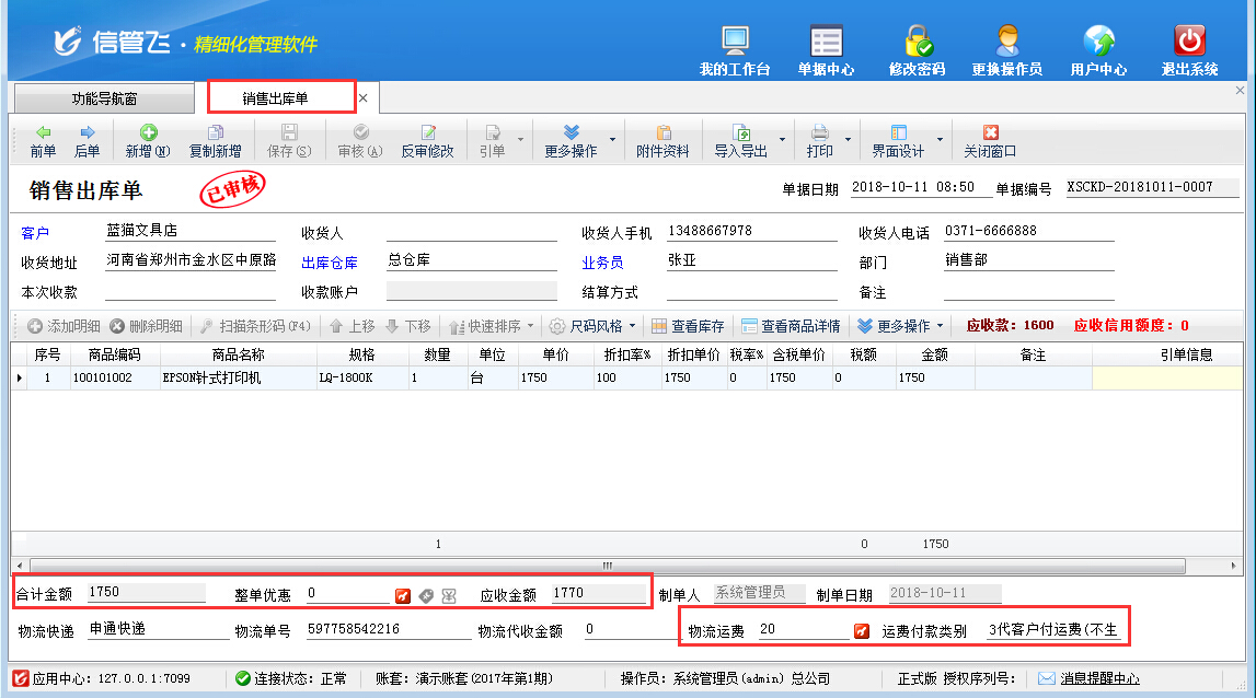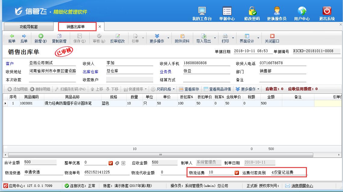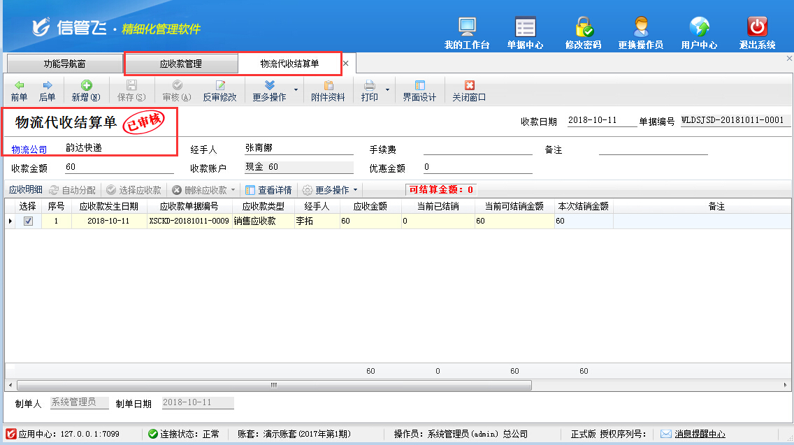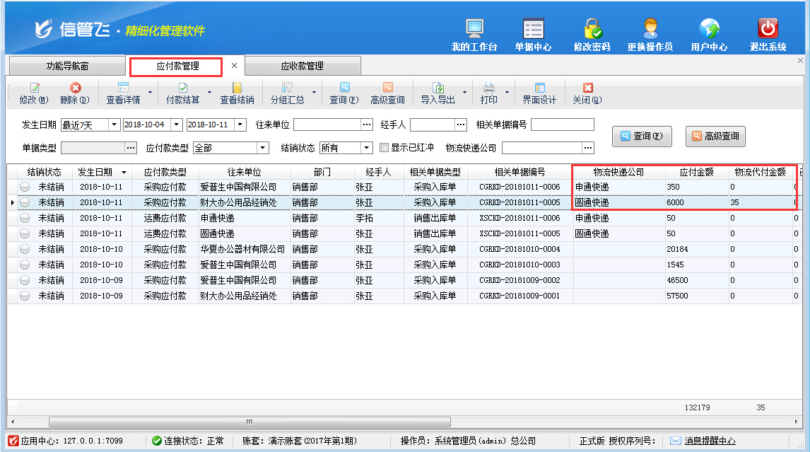 功能描述:物流運(yùn)費(fèi)結(jié)算功能通過(guò)在銷(xiāo)售出庫(kù)單和采購(gòu)入庫(kù)單中輸入物流快遞運(yùn)費(fèi)金額和物流快遞運(yùn)費(fèi)代收金額、代付金額。對(duì)生成的運(yùn)費(fèi)應(yīng)付款、運(yùn)費(fèi)代付金額和代收金額可以在往來(lái)管理應(yīng)收應(yīng)付款管理中進(jìn)行結(jié)算操作。支持定期結(jié)算(如月結(jié))和付現(xiàn)款的情況。