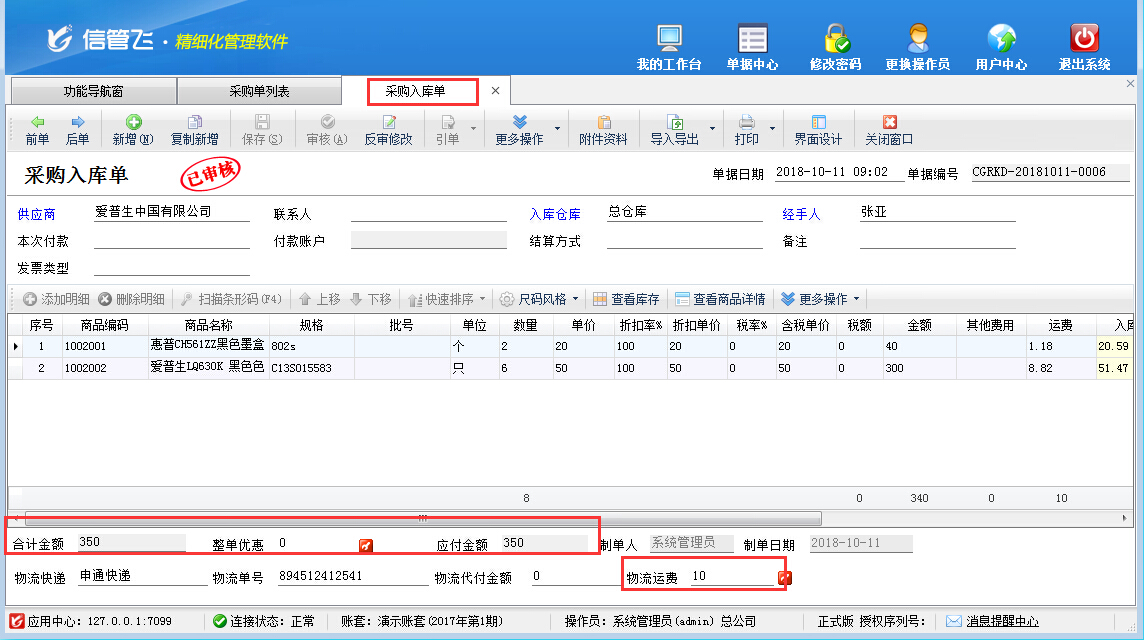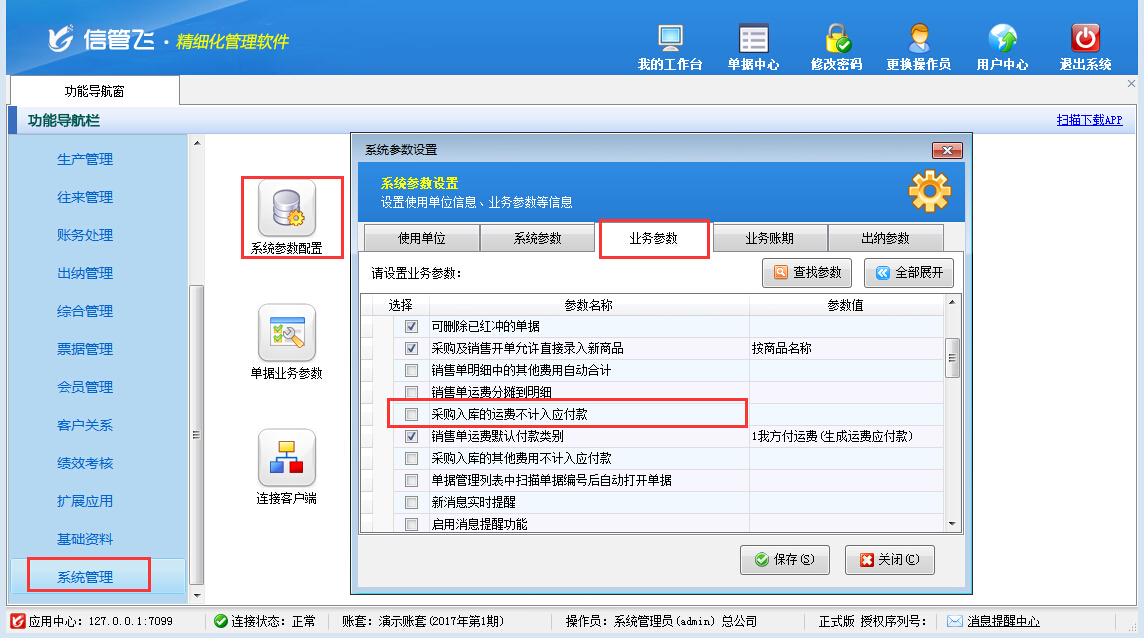 采購(gòu)入庫(kù)單中物流運(yùn)費(fèi)輸入有2種形式:采購(gòu)入庫(kù)的運(yùn)費(fèi)計(jì)入應(yīng)付款或者不計(jì)入應(yīng)付款,相關(guān)設(shè)置可以在系統(tǒng)管理—》系統(tǒng)業(yè)務(wù)參數(shù)中進(jìn)行配置(默認(rèn)計(jì)入應(yīng)付款)。