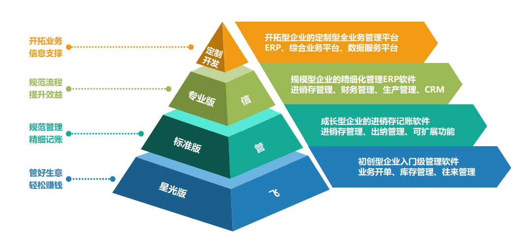 信管飛RMS分為星光版、標準版、專業版三個版本,包含的功能依次遞增,可適應不同發展階段和業務類型的管理需求。企業可根據自身業務管理需要進行購買,并可在后續根據業務管理需求變化升級到更高級的版本,實現數據平滑升級和軟件價值最大化!真正一套軟件,適應企業各個發展階段業務需要!