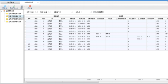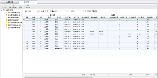 ????在功能導航窗點擊“擴展應用”——“績效分析”,即可進入到績效分析界面,包含業務員年度績效分析、業務員月份績效分析、部門年度績效分析、部門月份績效分析、業務員月份績效對比分析、部門月份績效對比分析、業務員客戶績效分析等,其界面如下圖所示。