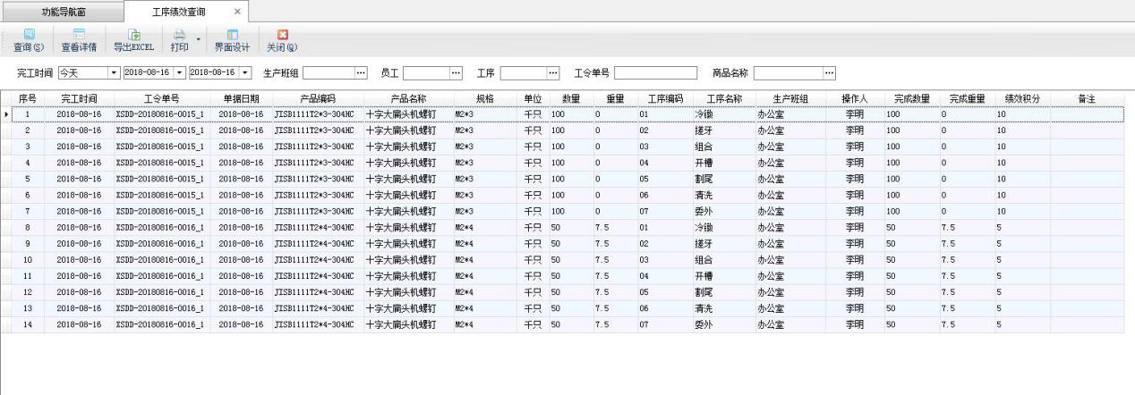 查詢:可以根據完工時間、生產班組、員工、工序、工令單號、商品名稱等條件對工序績效記錄進行查詢。