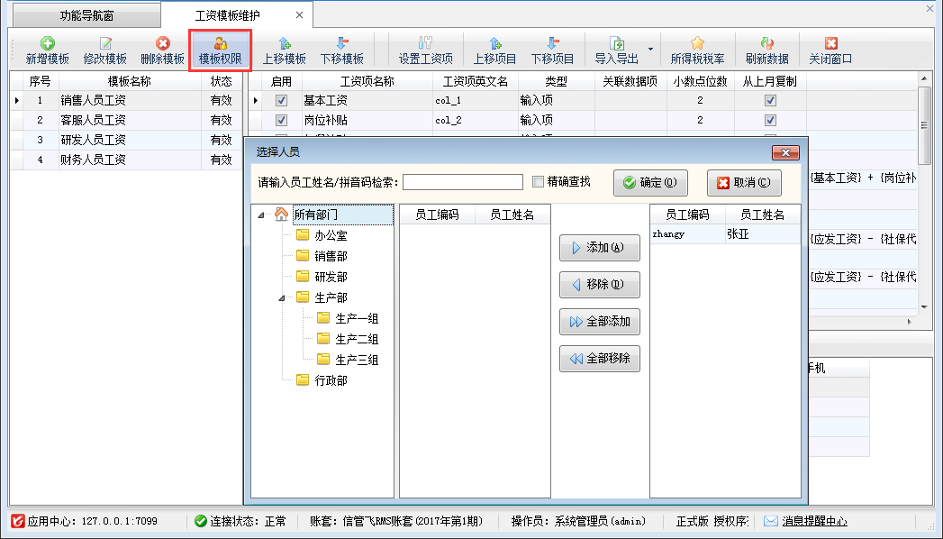 ????啟用此參數后,可以設置每個操作員可使用的工資模板,沒有權限的操作員,無法使用此工資模板且不能查看相應的工資單。