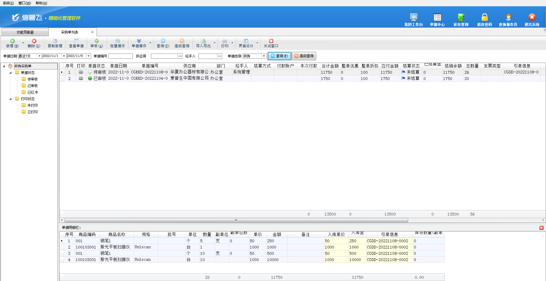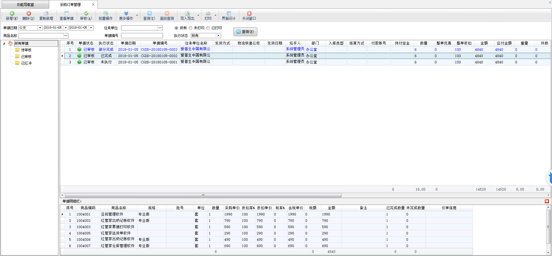 采購訂單查詢:可根據訂單日期、訂單編號、往來單位、商品名稱、執行狀態、審核狀態等各種條件查詢相應的采購訂單記錄。
