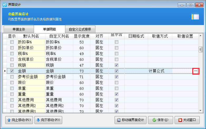 ????② 軟件支持通過界面設計配置單據的數據項,并可調整數據項是否顯示、顯示順序、自定義數據項名稱、顯示寬度、對齊方式、是否必填、取值方式和取值設置等。