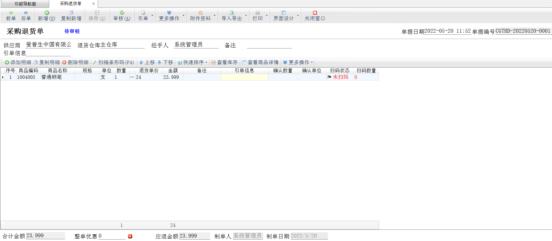 新增采購退貨單:在工具欄點擊“新增”—“采購退貨單”即可打開新增采購退貨單界面。