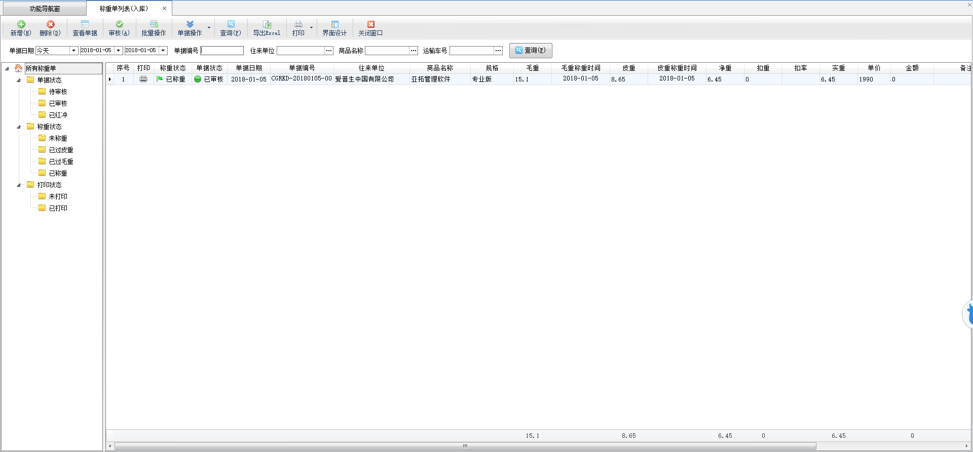 導出為 EXCEL:在工具欄中點擊“導出為 EXCEL”可以將采購單列表數據導出為 Excel 文件。 打印:點“打印”—》“打印稱重單”可以快速打印稱重入庫單;點“批量打印稱重單”可以批量打印稱重單(需啟用批量操作模式);點“稱重單打印格式設計”可以設置打印格式,有關打印格式模板設計的詳細操作說明參見打印格式模板設計專門手冊。
