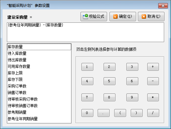 (1)參數設置:可以設置“建議采購量”的運算公式,軟件將根據您設計的公式計算出建議數量。