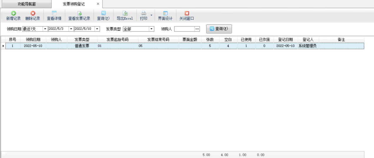????發票領購登記是對銷項發票空白發票的領購登記,發票領購登記后,在銷項發票管理界面會出現登記的空白發票記錄,可以用來填開發票。