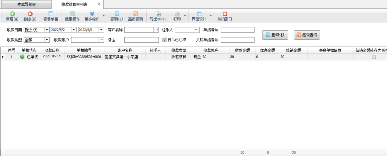 刪除:在工具欄點擊“刪除”按鈕可以刪除未審核的收款結算單,如果單據已審核則不允許直接刪除。已審核的結算單可以紅沖(在結算單窗口點“更多操作”—》“紅沖”)后,然后再刪除。