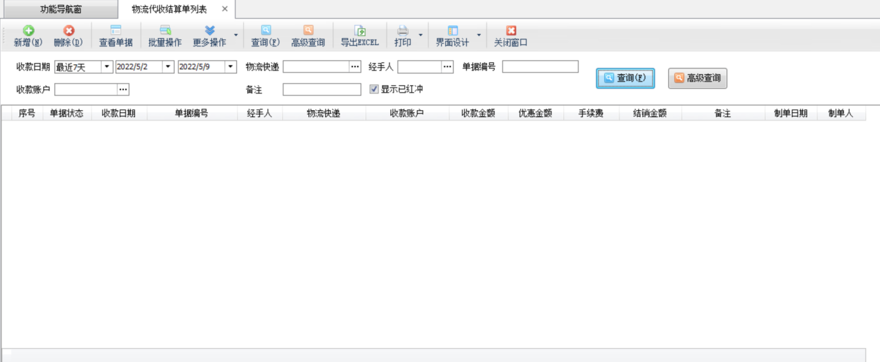 紅沖單據(作廢單據):在工具欄點擊“更多操作”—》“紅沖(作廢單據)”可以紅沖/作廢已審核的物流代收結算單。