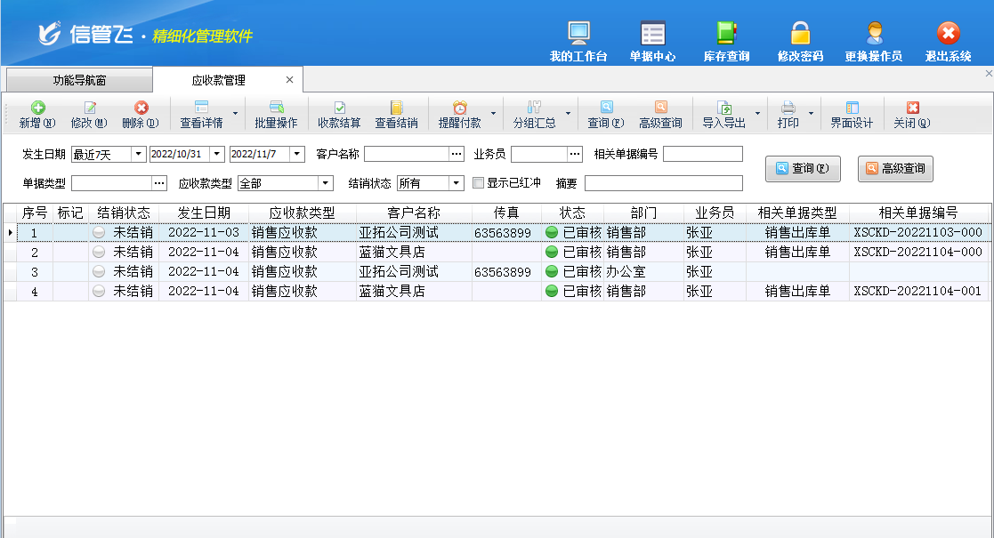 ????在功能導航窗點“往來管理”—》“應收款管理”即可進入應收款管理界面,如下圖所示: