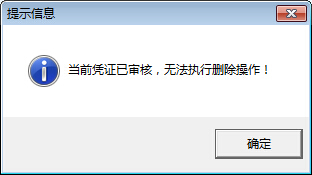 ????選擇一個憑證,然后點擊工具欄中的“刪除”按鈕,如果該憑證已審核,則系統不允許刪除,彈出如下的提示信息: