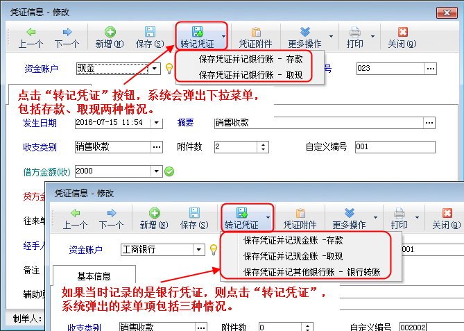 ????在新增或修改憑證時,系統支持“轉記憑證”功能,用于處理存款、取款、轉帳等涉及多個帳戶的憑證錄入,方便用戶操作,減少重復錄入。