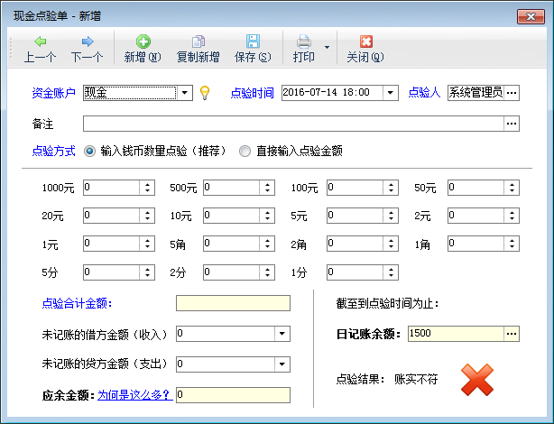 應余金額:應余金額=點驗合計金額 - 未記賬的借方金額(收入) + 未記賬的貸方金額(支出)。