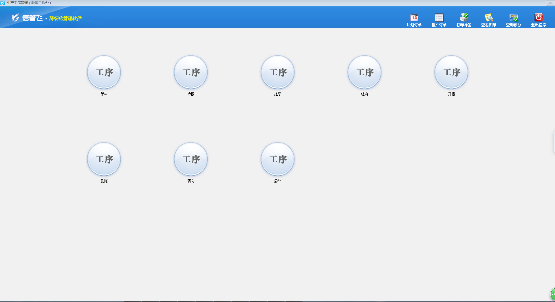 ????在功能導航窗點擊“生產管理”—》“生產工序管理”,即可進入生產工序管理(觸屏工作臺)界面(如下圖所示),此觸屏工作臺界面可操作的工序請在功能導航窗點擊“績效考核”—》“績效考核項目”中進行設置。