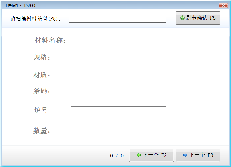 領料操作:點擊“工序(領料)”可以打開領料操作窗口,請掃描或者輸入原材料條碼選擇原材料,輸入領料數量并刷卡確認領料。