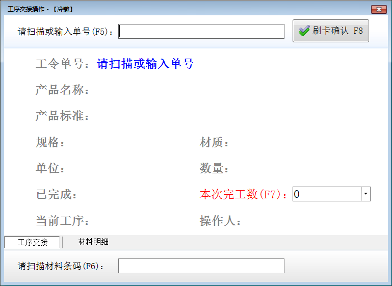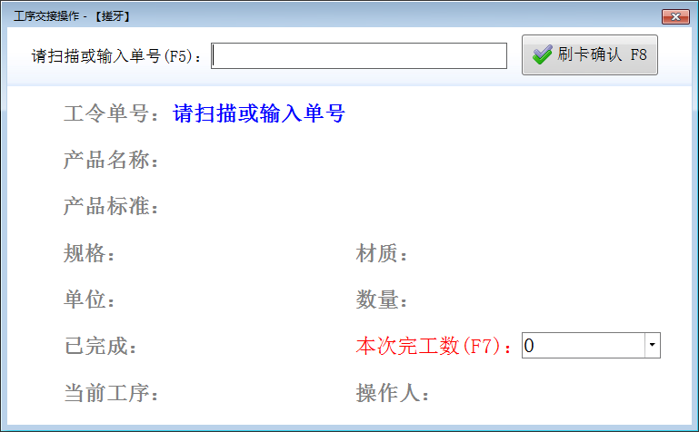 工序交接操作:冷鐓、搓牙、組合、開槽、割尾、清洗、委外為工序交接操作,操作人員選擇相應工序可以打開此工序交接操作窗口,請掃描或輸入工令單單號選擇工令單,輸入本次完工數量后進行刷卡確認工序交接,如圖所示。