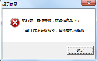 ????如當前工序設置不允許超交 ,則“完工數量”不能大于“計劃數量”,如果輸入的“完工數量”大于“計劃完成數量”,系統會彈出提示信息:“執行完工操作失敗,當前工序不允許超交,請檢查后再操作”。