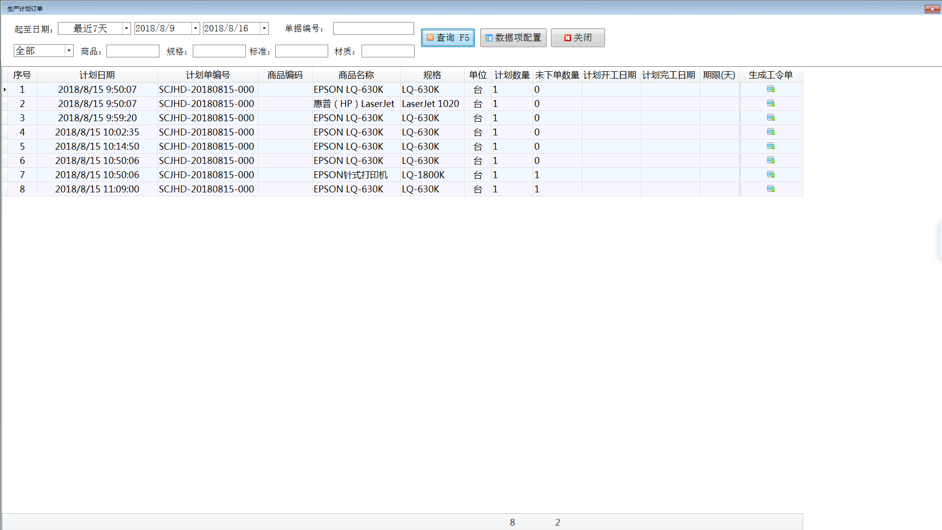 (3)生成單據:點“生成單據”按鈕,軟件會將列表中“計劃數量”不為空的記錄生成為生產計劃單。