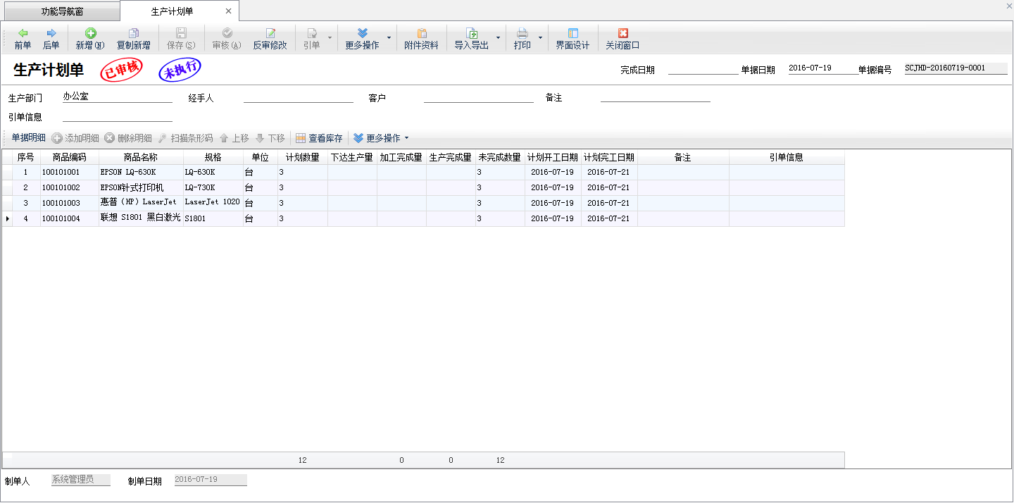 ????(1)未執行:新增加的生產計劃單,處于“未執行”狀態。