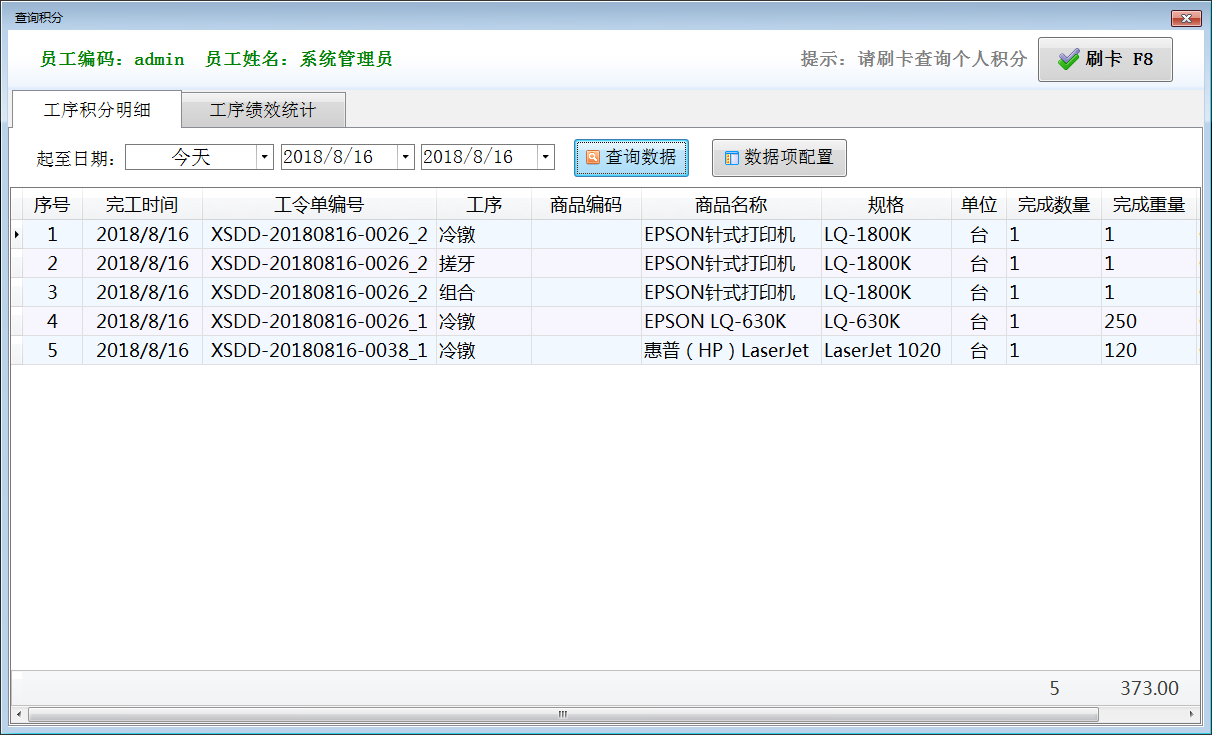 查詢積分:點擊“查詢積分”按鈕可以打開查詢積分窗口,請刷卡查詢個人積分,可以根據日期范圍查詢個人工序積分明細及工序績效統計積分。
