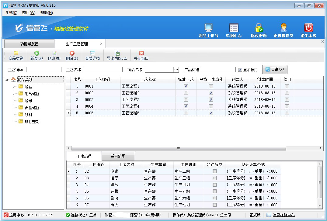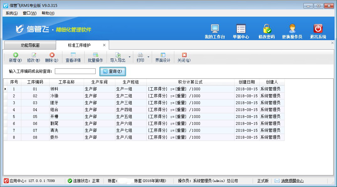 ????生產工序管理用于管理整個生產過程中各工段加工產品的次序,材料經過各道工序,最終加工成成品。通過對整個生產活動的分階段進行管理,使各階段銜接的良好有序,從而可以能提高產品質量和勞動生產率。
