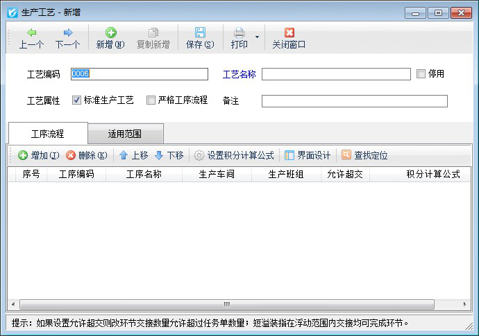 新增:點擊“新增”按鈕,可以新增生產工藝。