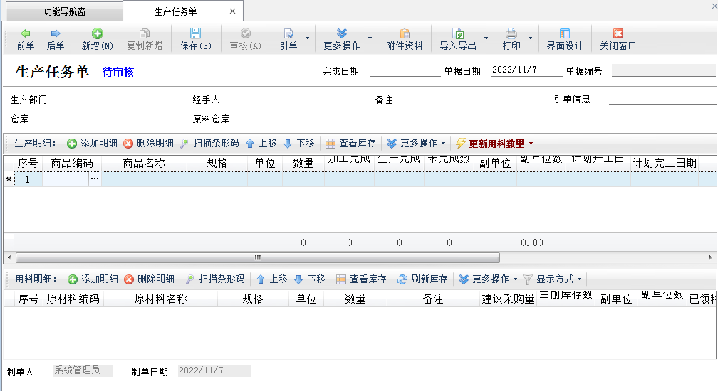 單據明細:引用或輸入生產商品明細后,只需要錄入“數量”,其他數量由后續業務單據引用生成任務單后,自動更新。