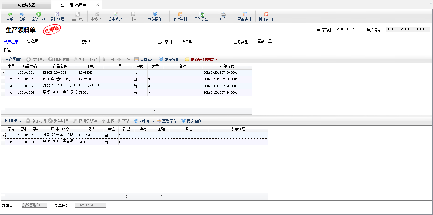 出庫倉庫:必填字段,保存審核單據后,該倉庫中領料明細中的商品(原材料和包材)其相應的庫存數量會減少。