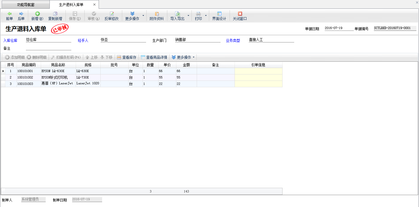 ????生產退料入庫單操作比較簡單,這里不再詳述。
