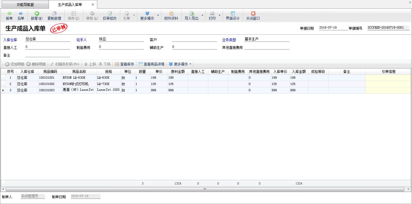 入庫倉庫:必填數據項,生產的產品將進入這個倉庫,單據保存審核后,相應商品的庫存數量增加。