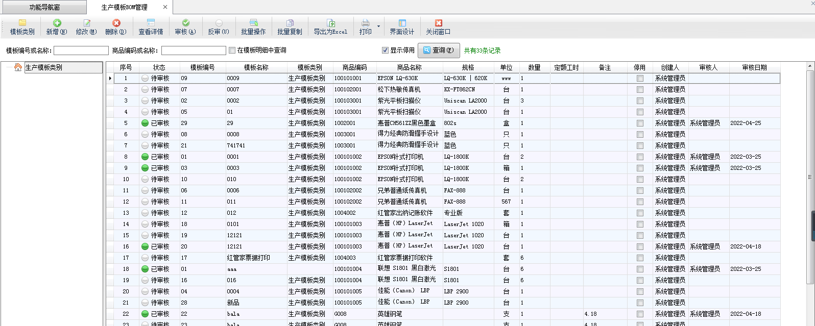 模板類別:可以維護模板類別,后續可以按照模板類別管理生產模板。點工具欄中的“模板類別”按鈕可以維護類別。
