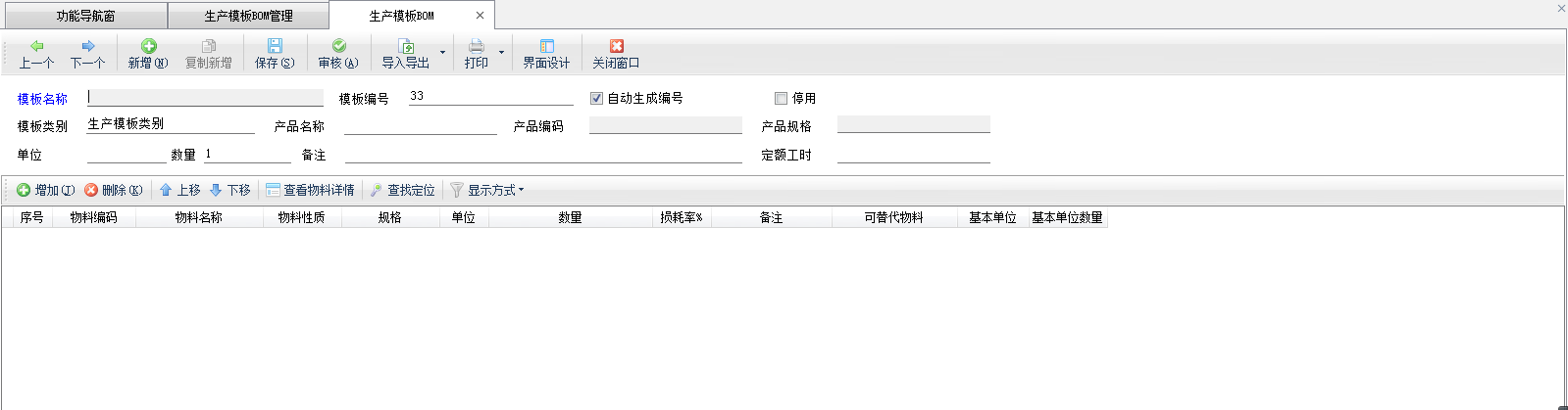 ????在功能導航窗,點“生產管理”—》“生產模板BOM”,即可進入生產模板界面,如下圖所示: