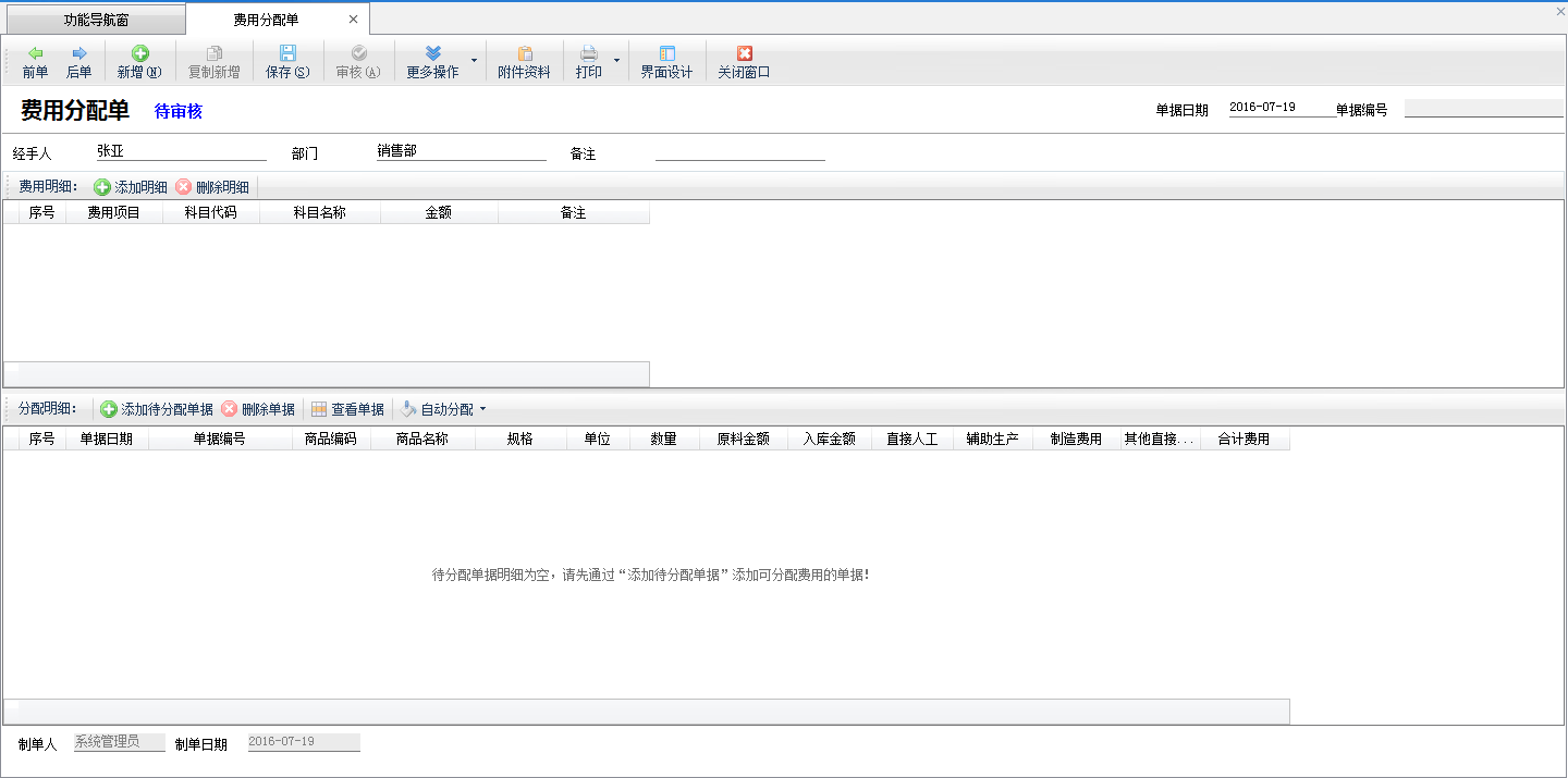 ????在功能導航窗,點“生產管理”—》“費用分配單”,即可進入費用分配單界面,如下圖所示: