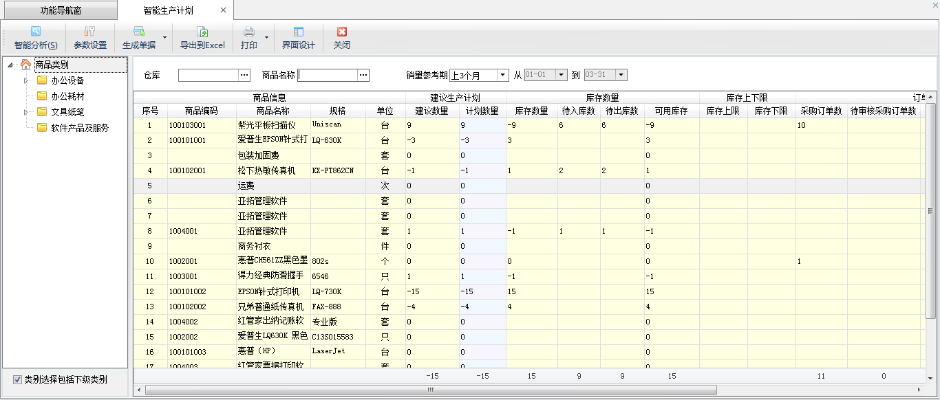 ????智能生產計劃可根據當前庫存情況,并可結合庫存上下限、往年同期銷售量、銷售訂單數量、待審核數量等條件進行組合運算,從而給出建議的商品生產建議數量,并可以把建議結果生成為生產計劃單。