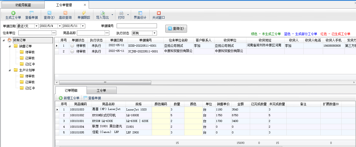 ????在功能導航窗點“生產管理”—》“工令單管理”即可進入“工令單管理”界面。工令單管理以列表的形式顯示最近的銷售訂單,可以查看訂單明細及訂單對應的工令單信息。