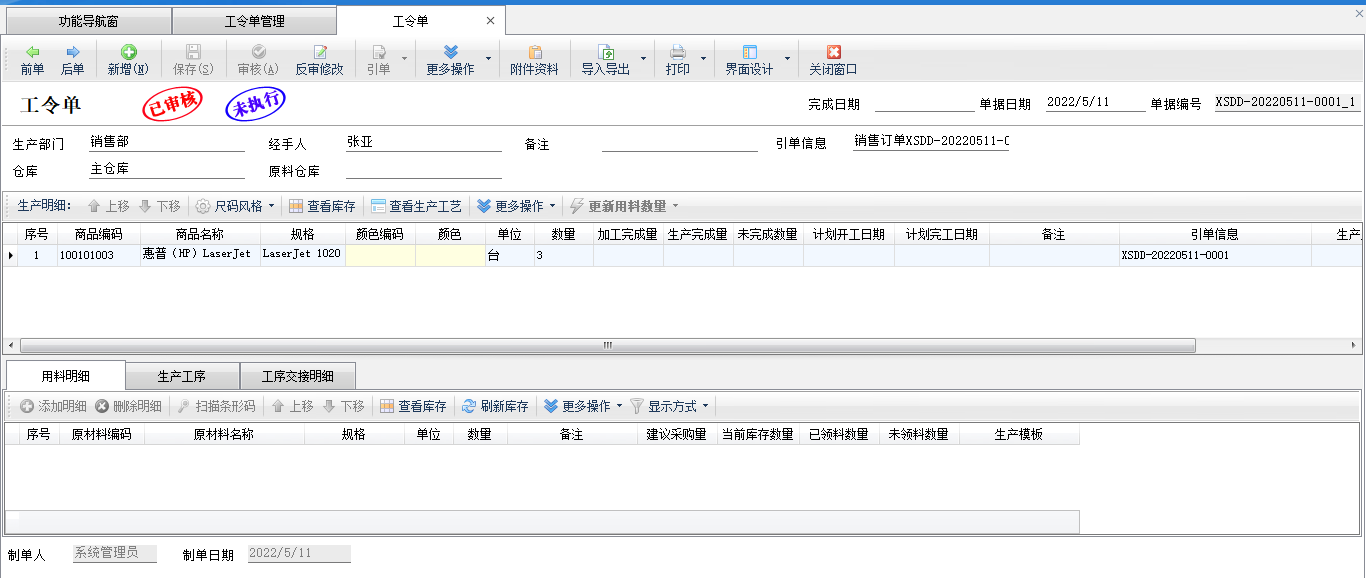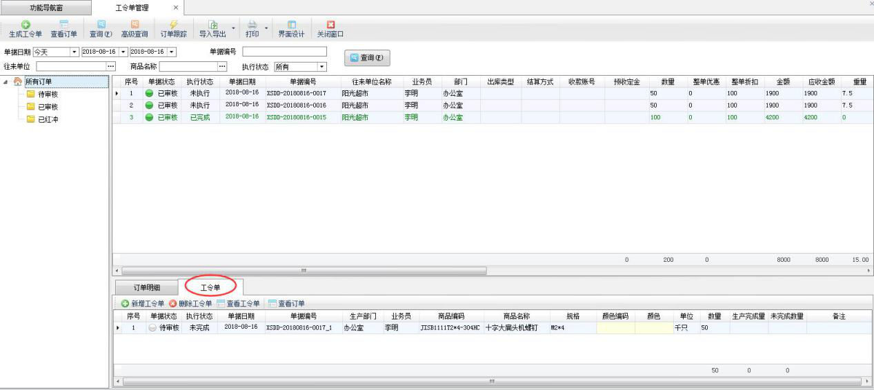生成工令單:在工具欄點擊“生成工令單”按鈕可以根據已審核銷售訂單生成工令單。