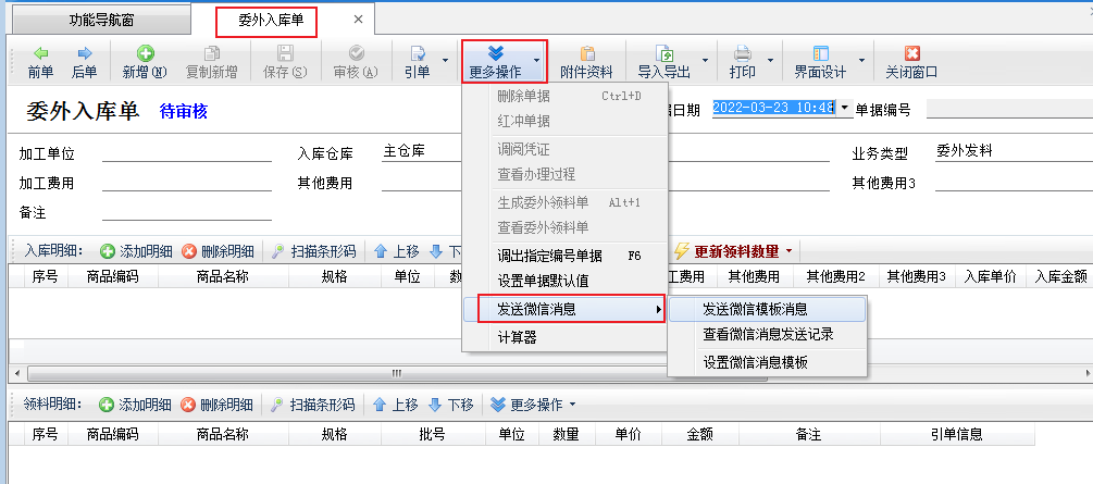 引單:委外領料單可以引用“委外加工單”,并將加工單中的產品明細作為單據的生產明細,同時如果相應的商品有生產模板則自動根據生產模板生成領料明細。