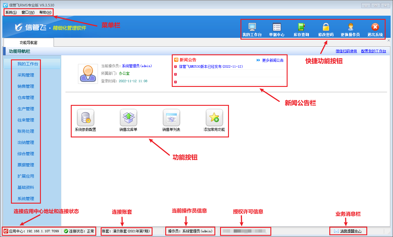 狀態(tài)欄:狀態(tài)欄顯示應(yīng)用中心地址、與應(yīng)用中心的連接狀態(tài)、當(dāng)前登錄的賬套、當(dāng)前操作員信息、業(yè)務(wù)提醒消息。