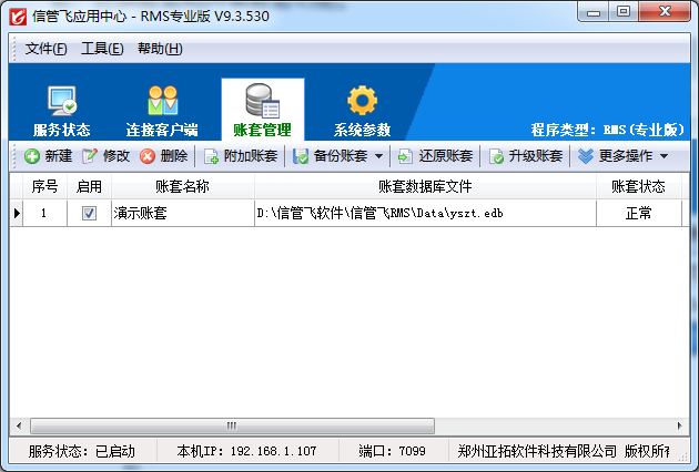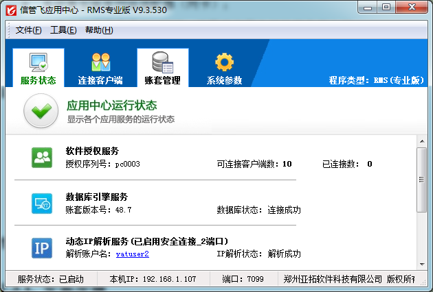 ????應(yīng)用中心程序是軟件的管理控制中心,集中管理連接客戶端和賬套數(shù)據(jù)庫,從而實(shí)現(xiàn)數(shù)據(jù)的集中存儲(chǔ)和實(shí)時(shí)共享。應(yīng)用中心主要包括運(yùn)行狀態(tài)管理、連接客戶端管理、賬套管理、系統(tǒng)參數(shù)配置等功能。
