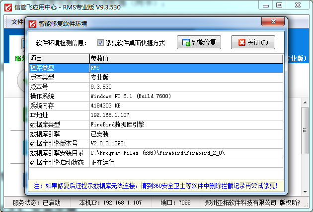 ????數(shù)據(jù)庫引擎服務(wù)顯示數(shù)據(jù)庫引擎的運(yùn)行狀態(tài),如果數(shù)據(jù)庫引擎無法正常連接,客戶端程序無法登錄,請(qǐng)重新安裝數(shù)據(jù)庫引擎(點(diǎn)菜單“工具”—》“智能修復(fù)軟件環(huán)境”中點(diǎn)擊“智能修復(fù)”按鈕即可重新安裝數(shù)據(jù)庫引擎)。