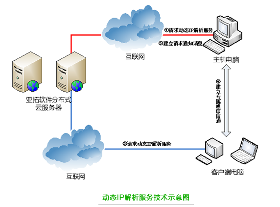 ????動(dòng)態(tài) IP 解析服務(wù)是亞拓軟件自主研發(fā)的互聯(lián)網(wǎng)遠(yuǎn)程連接解決方案,支持通過互聯(lián)網(wǎng)使用軟件,為客戶端與應(yīng)用中心連接提供安全、高效的傳輸通道。啟用動(dòng)態(tài) IP 解析服務(wù)后,客戶端電腦只要能夠連接互聯(lián)網(wǎng),就可以通過解析賬戶名和密碼連接到應(yīng)用中心使用軟件。動(dòng)態(tài) IP 解析服務(wù)的簡(jiǎn)單原理如下圖所示: