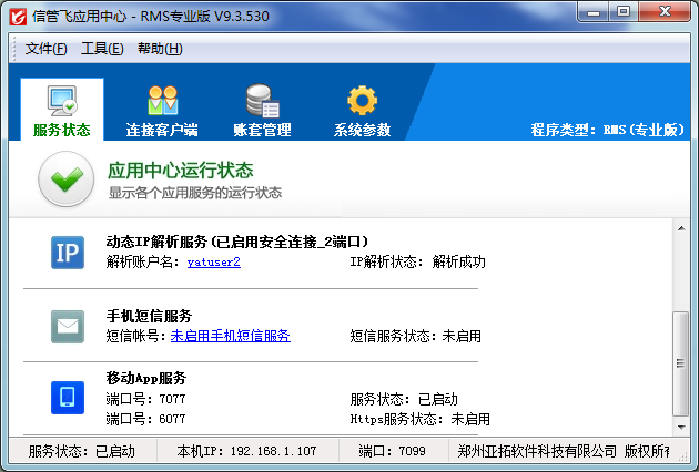 ????應(yīng)用中心的運(yùn)行狀態(tài)主要包括:軟件授權(quán)服務(wù)、數(shù)據(jù)庫引擎服務(wù)、動(dòng)態(tài) IP 解析服務(wù)、手機(jī)短信服務(wù)、移動(dòng) APP 服務(wù)、Web 服務(wù)(網(wǎng)頁查詢)、云打印服務(wù)等。部分服務(wù)在用戶購買了相應(yīng)的擴(kuò)展功能模塊才會(huì)顯示。