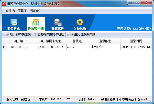 可以管理已連接到主機(jī)的客戶端電腦信息,包括客戶端 IP、客戶端網(wǎng)卡地址、登錄操作員、登錄賬套以及登錄時(shí)間。