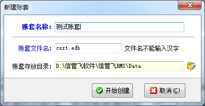 ????(1)新建:新建賬套時(shí),可以設(shè)置賬套名稱、文件名以及賬套的存放路徑。賬套文件名不支持漢字,請(qǐng)輸入字母或數(shù)字,并盡量不要使用特殊符號(hào)。賬套存放目錄我們建議使用默認(rèn)的目錄即程序所在目錄下的 Data 子目錄,方便后續(xù)管理和使用。