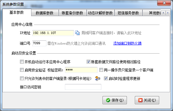 ????系統(tǒng)參數(shù)設(shè)置主要包括基本參數(shù)、數(shù)據(jù)庫參數(shù)、賬套備份參數(shù)、動(dòng)態(tài) IP 解析參數(shù)、短信服務(wù)參數(shù)、其他參數(shù)等。